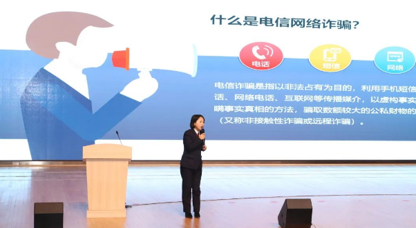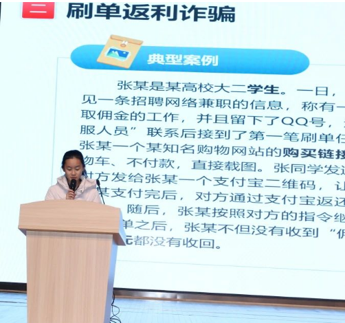 共青团乳山市委学少部部长高霖则向同学们解释了什么是权益岗,鼓励同学们生活中遇到麻烦或自己权益受到侵害时,要找权益岗部门寻求帮助。乳山市人民检察院检察官柳英华以“向电信网络诈骗说不”为题为全体师生展开法律宣讲。