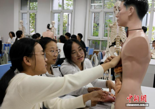 学生们在婴幼儿保育学课堂上拼接人体模型。赵晓 摄