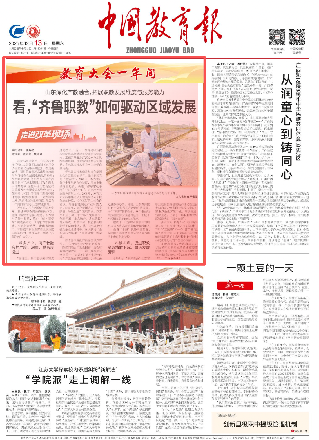 在青岛海尔集团,山东省技术能手张仁文带领团队编制《家用空调器安装优质服务规范》;在贵南高铁,司机陈鑫驾驶高速综合检测列车行驶在全线最难操纵的路段;在新疆麦盖提,努尔艾合买提在沙漠里养出了淡水澳洲龙虾;在西太平洋某海域,操舵手徐文茜驾驶我国首艘万吨大驱南昌舰驰骋大洋;在刚果共和国,非洲青年跟着中国师傅学习挖掘机维修……这些纵横山河、跨越行业的生动画面,背后有一个共同的指向:山东职业教育。 近年来,从产教融合的深度实施,到县域职教资源的精准下沉,再到日常生活的暖心服务,东西协作的带土移植,海外“班·墨学院”的创新布局,山东打破校园围墙、突破教育边界、走出省域国门,不断拓展职业教育的发展维度与服务能力,擎旗奋进,擦亮“齐鲁职教”金名片。 服务产业: 向产教融合的广度、深度、黏合度挺进 “在这里,我们能学到非常先进的技术。”近日,在青岛职业技术学院海尔智慧楼宇全球服务学院内,正在开展磁悬浮离心式冷水机组实操培训,企业培训讲师现场指导,青岛职业技术学院学生李悦自豪地说。 青岛职业技术学院与海尔集团的合作已延续20多年,是名副其实的“老搭档”。2002年,双方签订首个十年战略合作协议,从家电维修专业起步,共建“海尔家电学院”“海尔服务中心”,定向培养售后服务管理人才。2008年,双方又面向海尔集团从大规模制造向个性化定制转型,校企签订第二轮合作协议,培养智能制造产业所需人才。2023年,海尔集团进入“数字赋能、场景生态”发展阶段,双方又开启了第三个十年的战略合作,创新开展“生态融合、共生共长”育人模式。20多年来,校企联合培养学生6000余人,其中20%以上成长为企业业务骨干,35人获得“山东省技术能手”“最美创客”等荣誉。 作为全国首批产教融合试点省份,山东持续完善产教融合政策,十四部门联合印发全国首个混合所有制办学政策,十一部门联合出台全国首个“金融+财政+土地+信用”产教融合激励措施,引导社会力量参与办学。目前,山东做深做实47个省级行业产教融合共同体、56个市域产教联合体,88个混改项目拉动社会投资超百亿元,形成了产教相互赋能的生态环境。 据统计,山东职业院校年均培养60多万名高素质劳动者和技能人才,全省“十强”优势产业集群、乡村振兴等领域新增从业人员70%以上来自职业院校。 扎根县域: 促进职教资源精准下沉、激活发展引擎 今年7月,“职兴百县”山东省职业教育服务县域经济活动在烟台龙口启动,92所职业院校与龙口54家重点企业齐聚于此。需求直通、资源直达,上演了一场职业教育与区域经济的“双向奔赴”。 活动期间,裕龙石化、南山智尚等6家企业挂牌“实习实训基地”。“两个‘工匠班’和一个‘订单班’已纳入统招计划,未来3年要让毕业生输送量翻番!”山东科技职业学院招生就业处处长刘广合信心满满。 在威海荣成,威海海洋职业学院教师团队研发的黄曲霉毒素脱除技术,试点区域花生AFB1污染率降低60%,带动农户增收15%。在枣庄滕州,枣庄科技职业学院牵头组建高端装备智能制造市域产教联合体,近3年培养输送8500余名技能人才,助力建设“中国中小机床之都”。在潍坊青州,潍坊工程职业学院校地共建花卉学院,教师科研团队为当地解决技术难题60多项,为136个花卉生产专业村培训花农2万余人次。 目前,山东省县域内高职院校达30所,年均为县域输送近10万名高技能人才。同时,在特色产业基础雄厚、产业人才需求迫切的强县、特色县,遴选122所高水平中职学校与高职院校联合举办五年制高职教育,让更多孩子在县域读书、县域就业。 此外,山东还大力发展面向“三农”的职业教育,建成50所山东省乡村振兴示范性职业院校,探索“田间大学”“乡村学院”等办学模式,年均开展实用技术培训超过250万人次。 汇入生活: 贴近需求,让职教服务触手可及 “我们要成为‘毛孩子’的健康后盾。”山东畜牧兽医职业学院副教授侯显涛擅长宠物中医诊疗,曾用中药与针灸治愈了一只四肢瘫痪的比熊犬。该校采取混合所有制形式,校企共建心仪宠物医院,构建中西医结合的特色诊疗体系,成为山东省内首家荣获五星认证的动物医院,锦旗挂满墙壁。 在山东特殊教育职业学院的实训室里,听障学生在专注地修复破碎陶片,专业教研室主任李傲说:“他们注意力高度集中,很适合文物修复。”2019年,该校开设面向听障学生的文物修复与保护专业,为特殊学生搭建实现自我价值的平台。 山东职业学院对接各地铁公司开展订单式培养,累计为深圳、宁波、青岛、济南等21个城市输送8000名一线地铁运营人才。“母校教会我的不仅是技能,更是责任。”该校毕业生陈鑫如今已是贵阳机务段动车组的年轻技能骨干,在高铁驾驶领域展现扎实的专业素养。此外,山东多所职业院校还联合部队举办士官班,定向培养军士。山东交通职业学院的徐文茜,便是海军第一批定向培养的女军士,已成长为南昌舰上的“最强女舵手”。 通过东西协作,山东职教跨越山海,每年组织50多所职业院校、近千名师生赴新疆、西藏、青海支教,将先进的职教理念和技术带到西部,持续向西部传送优质职教资源。 “没想到在沙漠里也能养出澳洲龙虾!”新疆喀什麦盖提县的努尔艾合买提,现在已是当地小有名气的“养虾能手”。这一突破,源于日照职业
