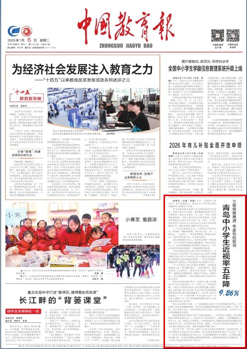 本报讯(记者 刘淼)5年,近视率下降9.26%,每年降幅超1%。青岛市中小学生视力情况的最新统计数据令人欣喜。