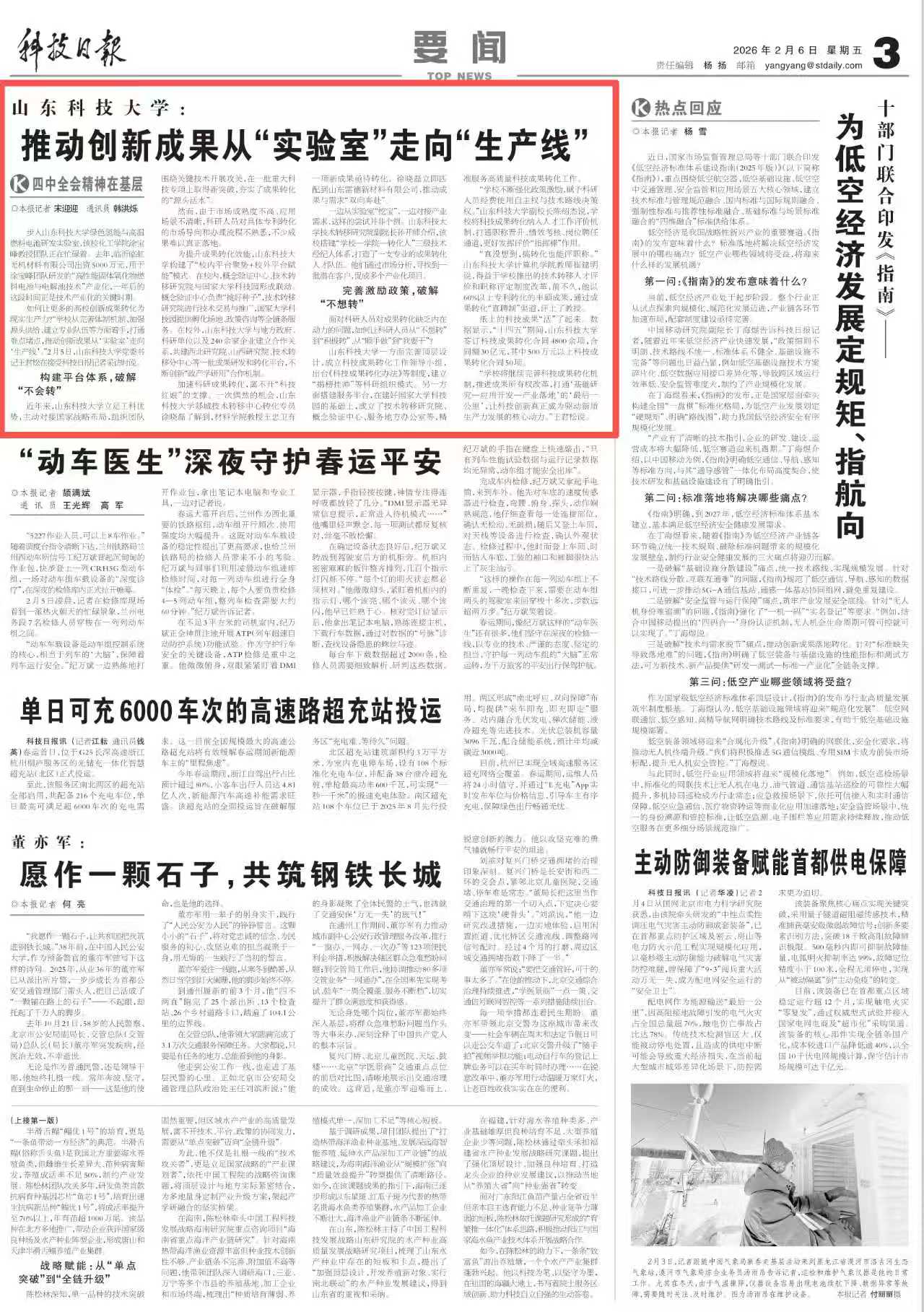 如何让更多的高校创新成果转化为现实生产力?“学校从完善体制机制、加强源头供给、建立专业队伍等方面着手,打通难点堵点,推动创新成果从‘实验室’走向‘生产线’。”2月5日,山东科技大学党委书记王君松在接受科技日报记者采访时说。