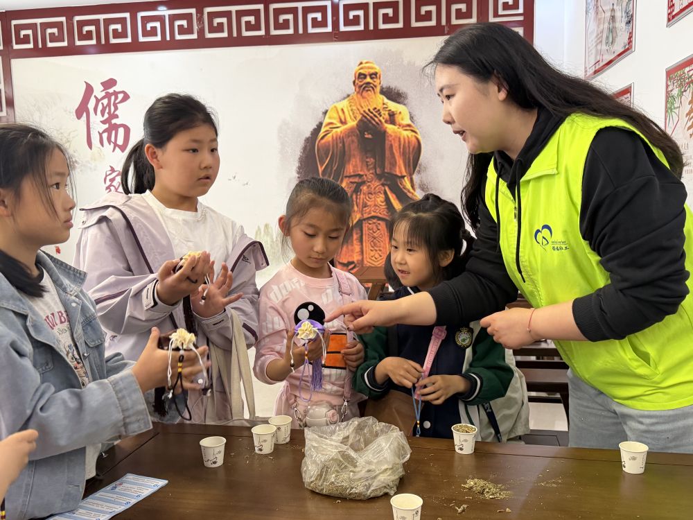 16日,乐陵市小学生在乐陵市市中街道安居社区内体验香囊制作。新华社记者 张力元 摄